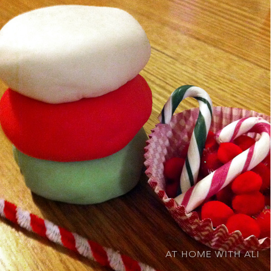 I divided each batch of playdough into six portions and individually wrapped them in cling wrap. Each gift pack contained a portion of red, green and white playdough with a few accessories – red and white patty pans, pom poms and two candy canes. The whole lot was wrapped in clear cellophane and tied up with a pipecleaner.